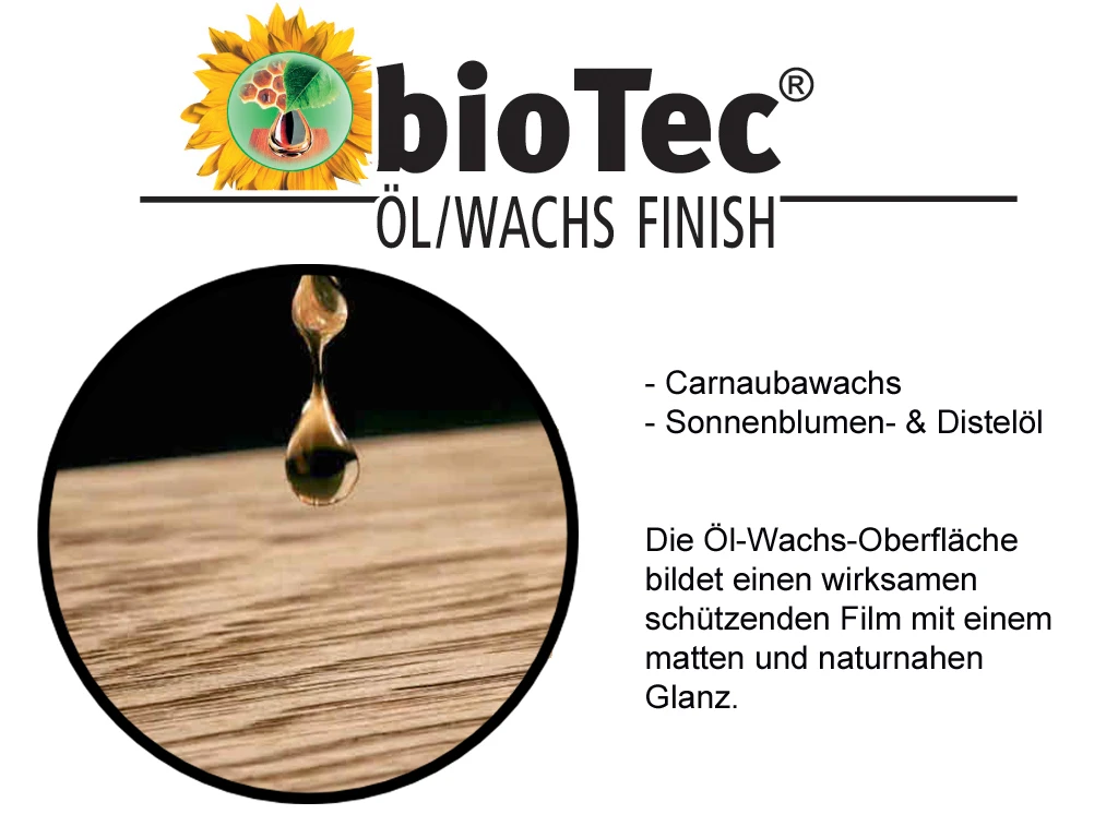 - Couche d’usure en bois noble de 2,5 mm d’épaisseur avec une finition de surface protectrice et facile d’entretien – selon l’article, soit avec une surface huilée-cirée bioTec proche de la nature, une finition de surface mate naturelle, soit avec une vitrification résistante (permaDur).