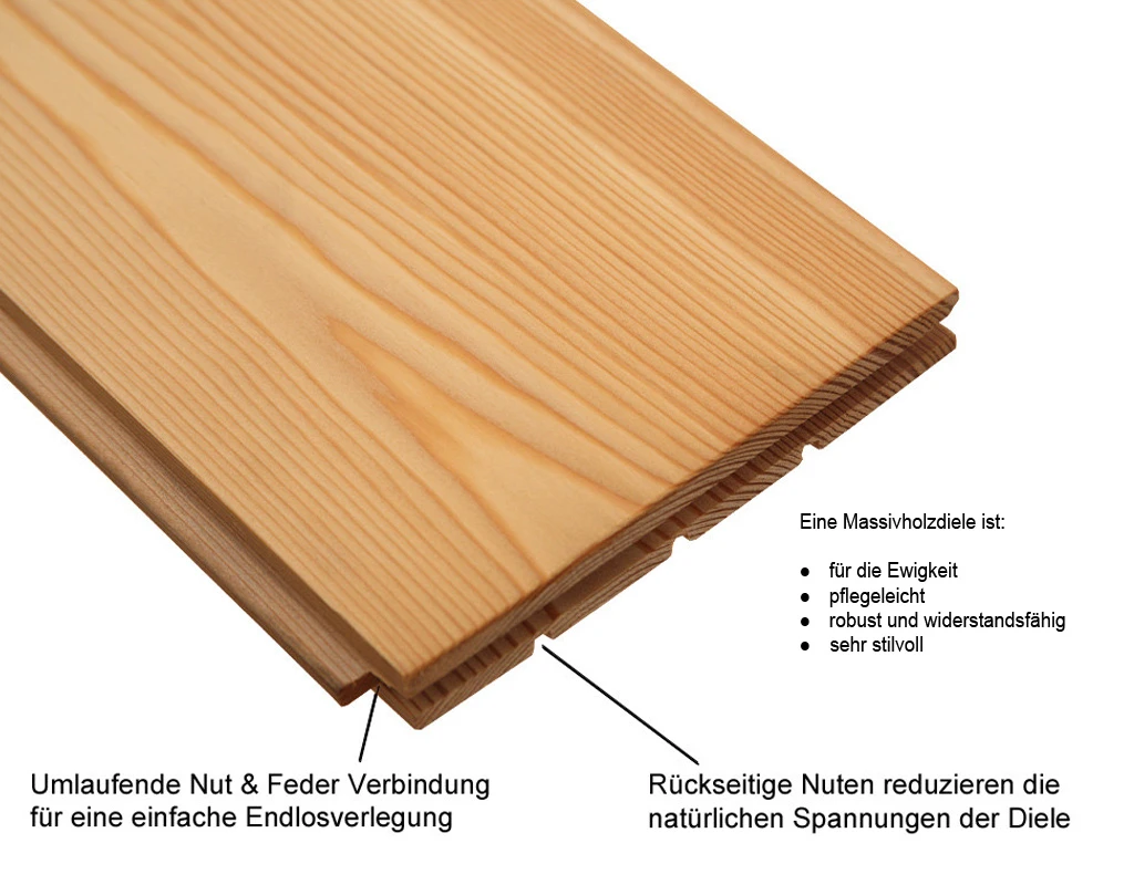 Le chanfrein périphérique sur les quatre côtés structure l’aspect de la pose et lui confère un motif régulier. Les huiles naturelles de haute qualité utilisées pour le traitement de surface laissent le bois respirer et le protègent. Avec la surface poncée, les creux dans la lame sont parfaitement compensés. Le sol devient ainsi parfaitement plat.