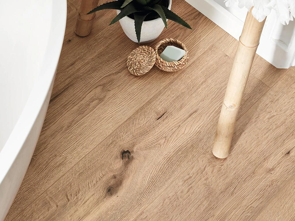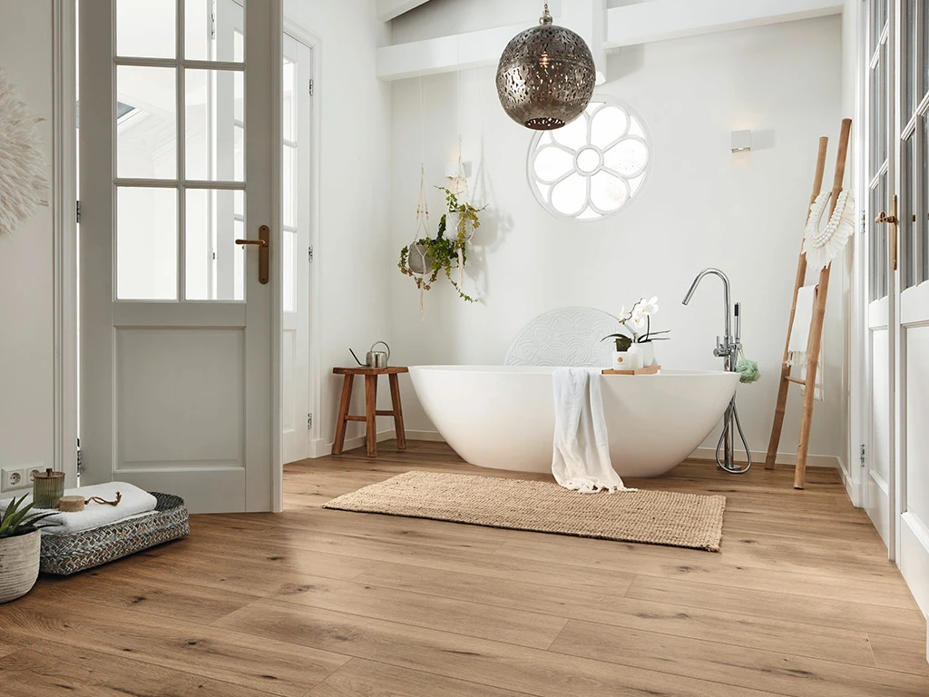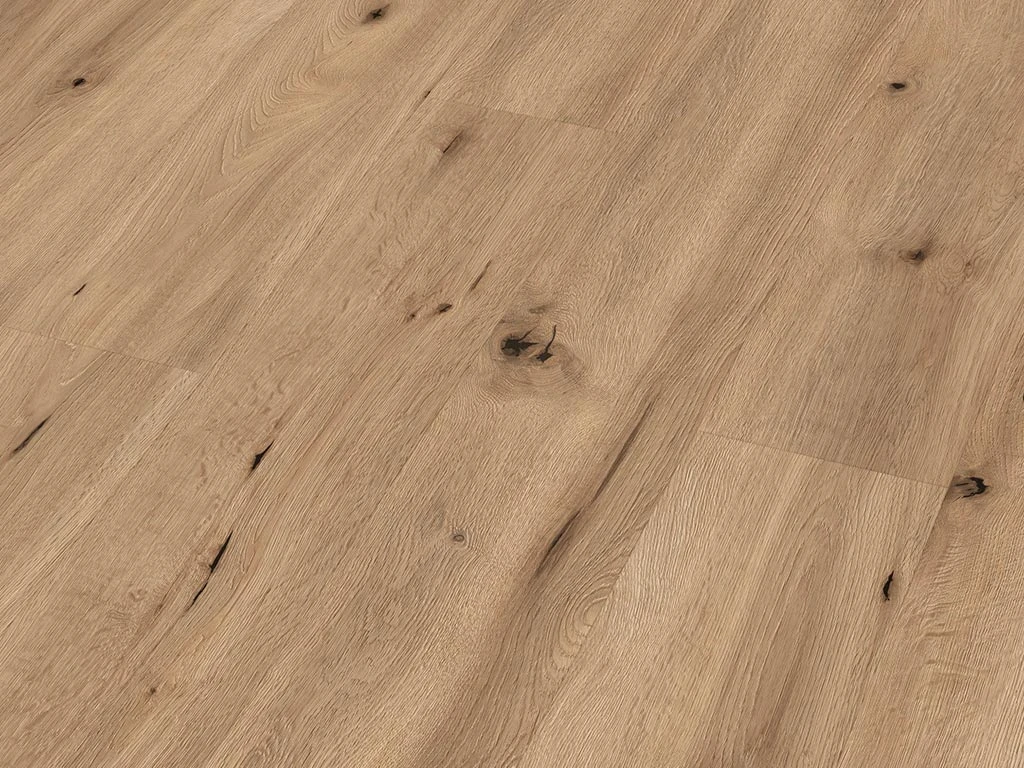 Avec sa couche d’usure de 0,2 mm, ce sol convient parfaitement à des pièces telles que la chambre à coucher ou le bureau.