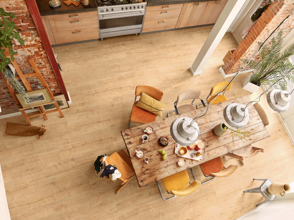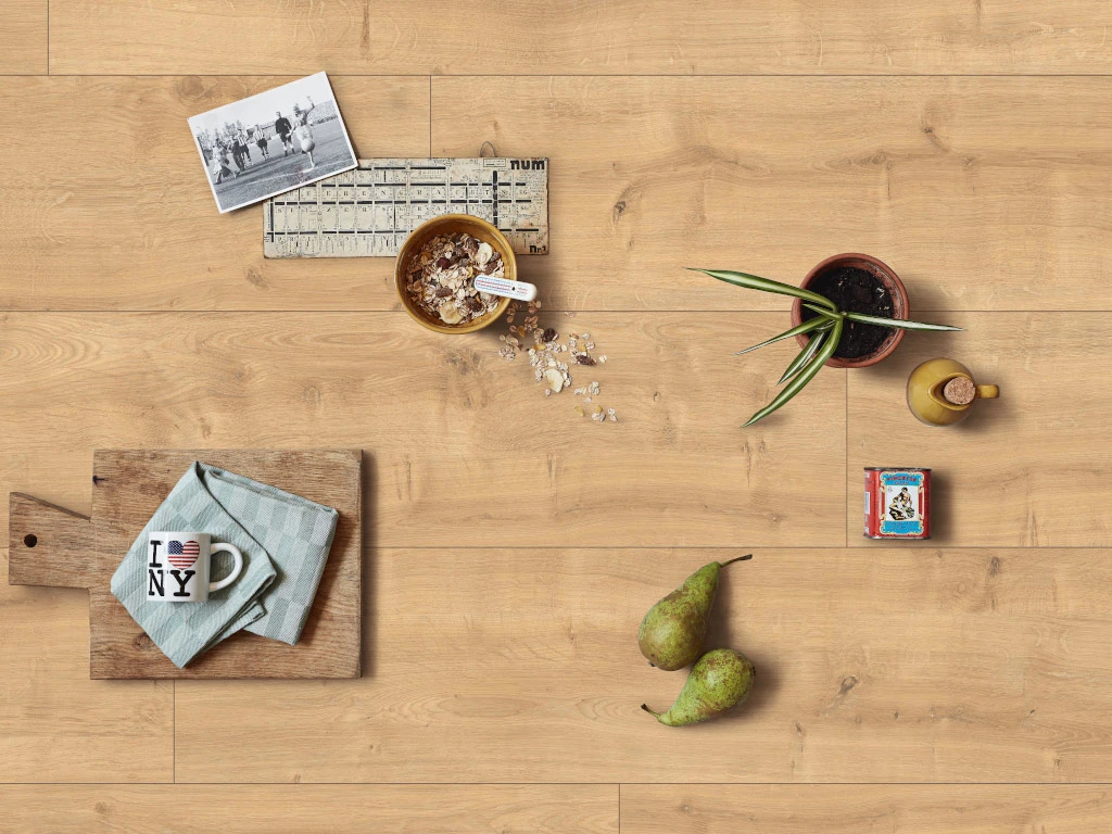 Les veinures typiques du chêne du décor dégagent une classe intemporelle et une chaleur confortable.