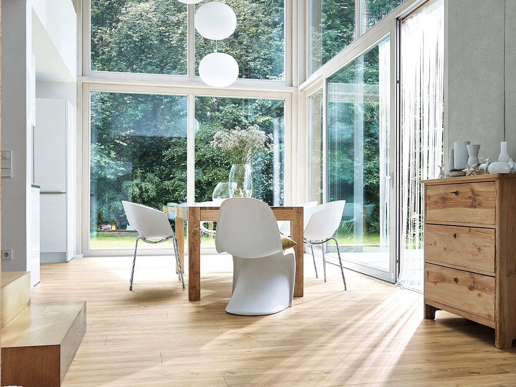 Avec sa couche d’usure de 0,2 mm, ce sol convient parfaitement à des pièces telles que la chambre à coucher ou le bureau.