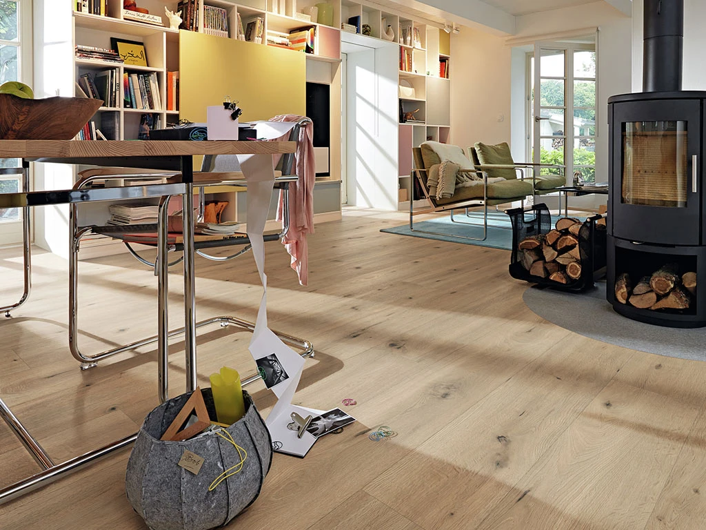 Les veinures typiques du chêne du décor dégagent une classe intemporelle et une chaleur confortable.
