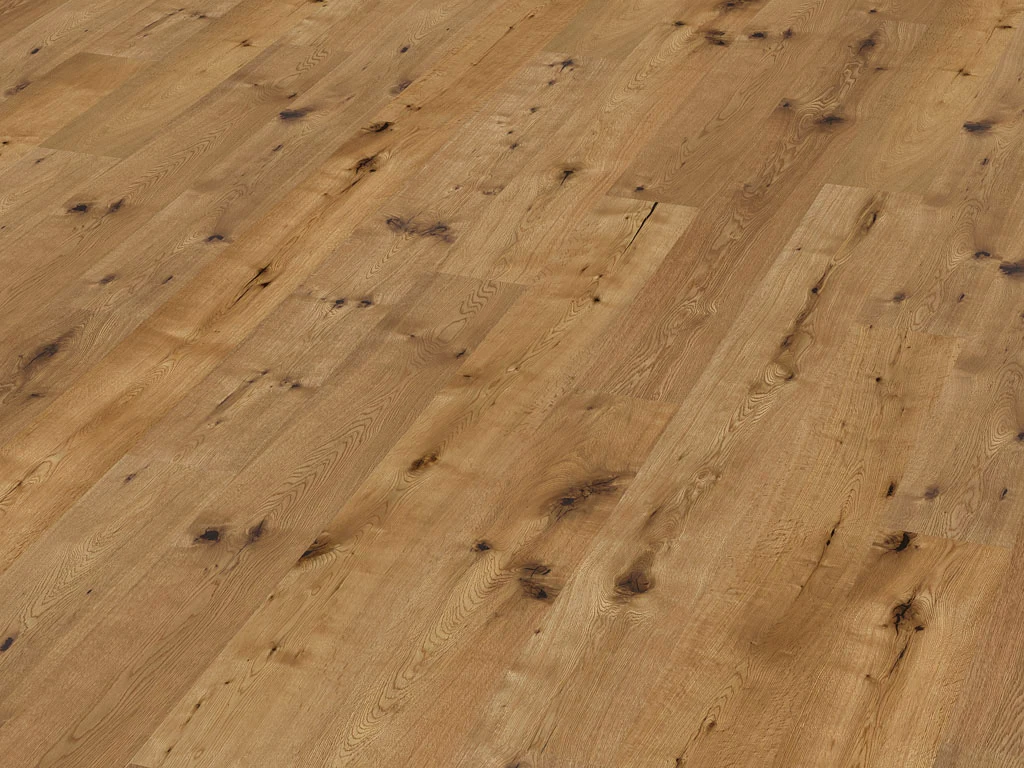 Ce parquet en chêne est d’une beauté intemporelle – le véritable chêne parle de lui-même. Mais le chêne a également des atouts techniques : en raison de sa densité élevée, cette essence de bois est particulièrement conductrice de chaleur et permet d’avoir toujours les pieds au chaud.