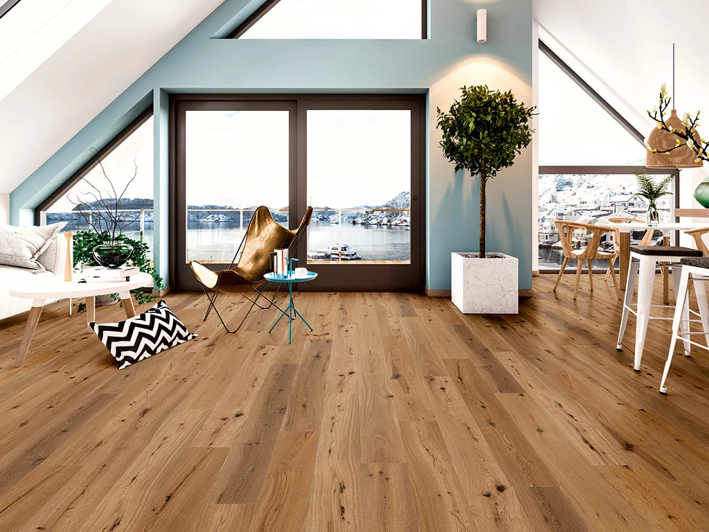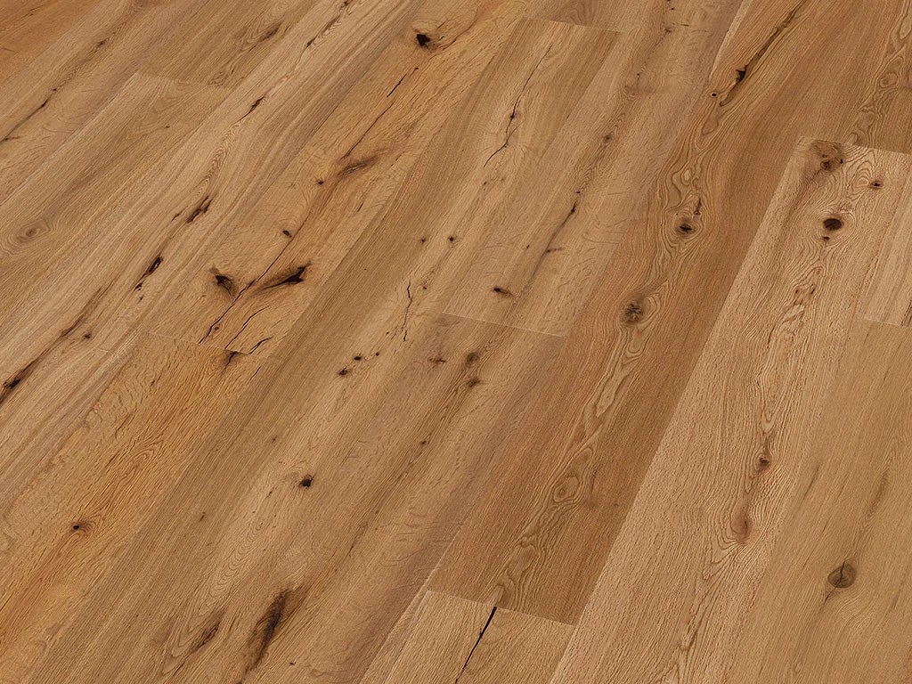 Les parquets rustiques possèdent, grâce à leur aspect monolame, un look naturel et rustique qui donne à chaque pièce un aspect chaleureux. Le chanfrein sur les quatre côtés structure l’aspect de la pose et lui confère un motif régulier. Les huiles naturelles, qui pénètrent profondément dans la surface du bois, le protègent ainsi de l’humidité et le rendent facile à entretenir. Débarrassé des couches de bois plus tendres, le bois de cœur dur et stable de la lame forme une surface sensiblement structurée, tridimensionnelle et vivante.