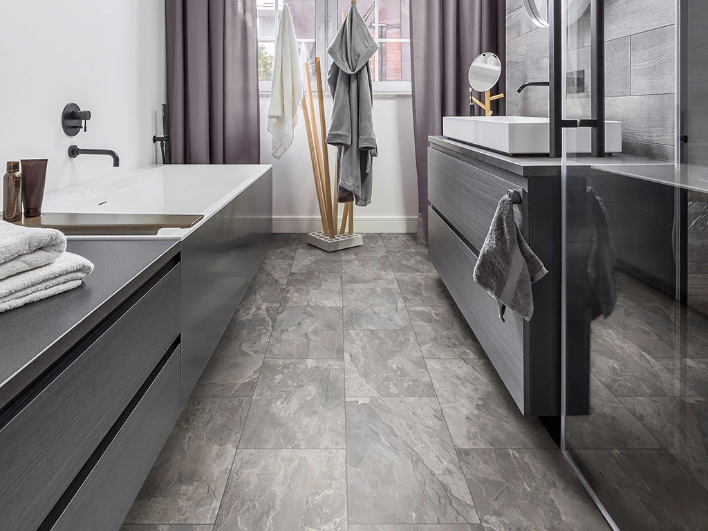 L’aspect classique du carrelage souligne le toucher de ce revêtement de sol élégant et moderne, qui ne fait pas seulement bonne figure dans la cuisine ou la salle de bains Les rainures en V sur les 4 côtés renforcent le caractère de la lame et lui donnent plus de structure. Grâce aux technologies de gaufrage les plus modernes, la surface structurée de ce sol imite la texture de la pierre jusque dans les moindres détails.