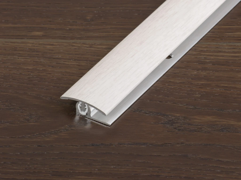 - Pour les profilés de transition et d’adaptation, le profilé de recouvrement des revêtements de sol à relier est encliqueté dans l’articulation en plastique du profilé de base.