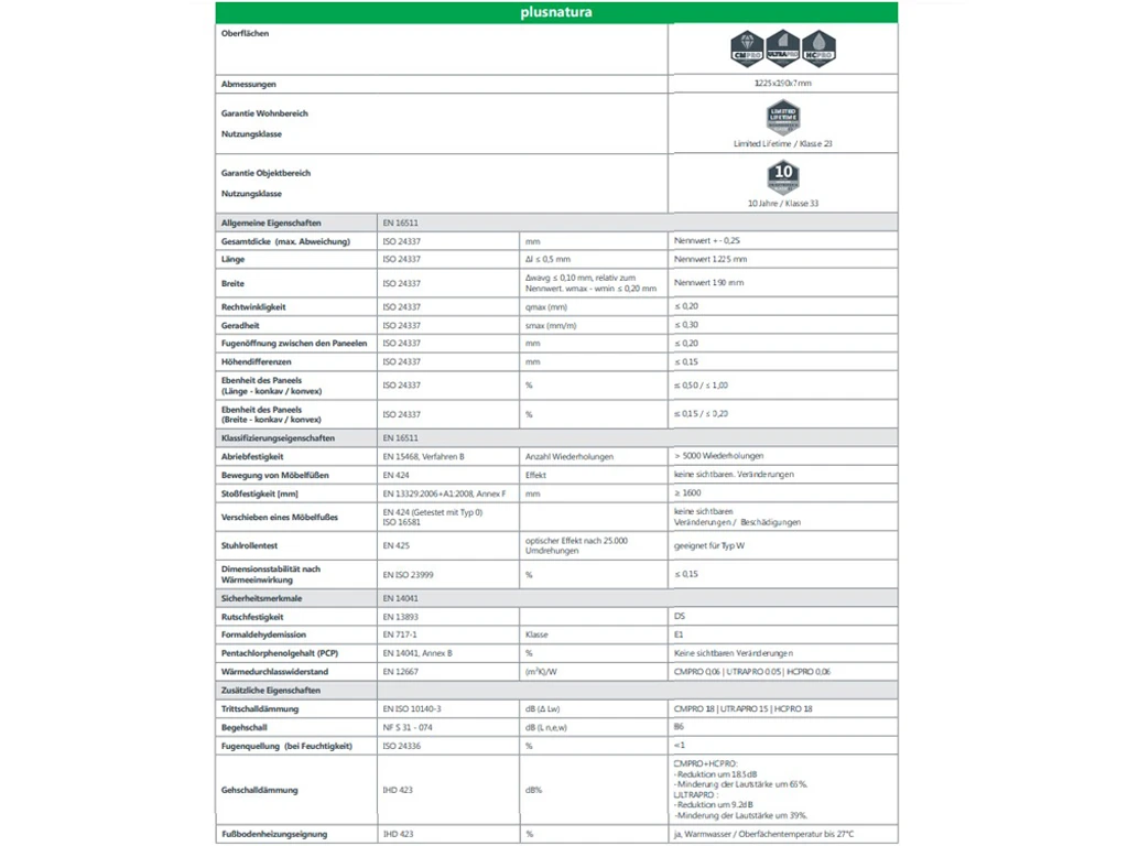 L’âme rigide utilisée dans ce sol est un support en liège. Elle est composée d’un mélange de substances naturelles, comme la poudre de pierre. La particularité est qu’il n’y a pas d’ajout de PVC, comme c’est le cas pour de nombreux autres supports Rigid. Les propriétés d’utilisation n’ont rien à envier à celles des panneaux de support rigides comparables. Les produits Plusnatura sont 100 % écologiques et ont reçu le label « Blauer Engel ».