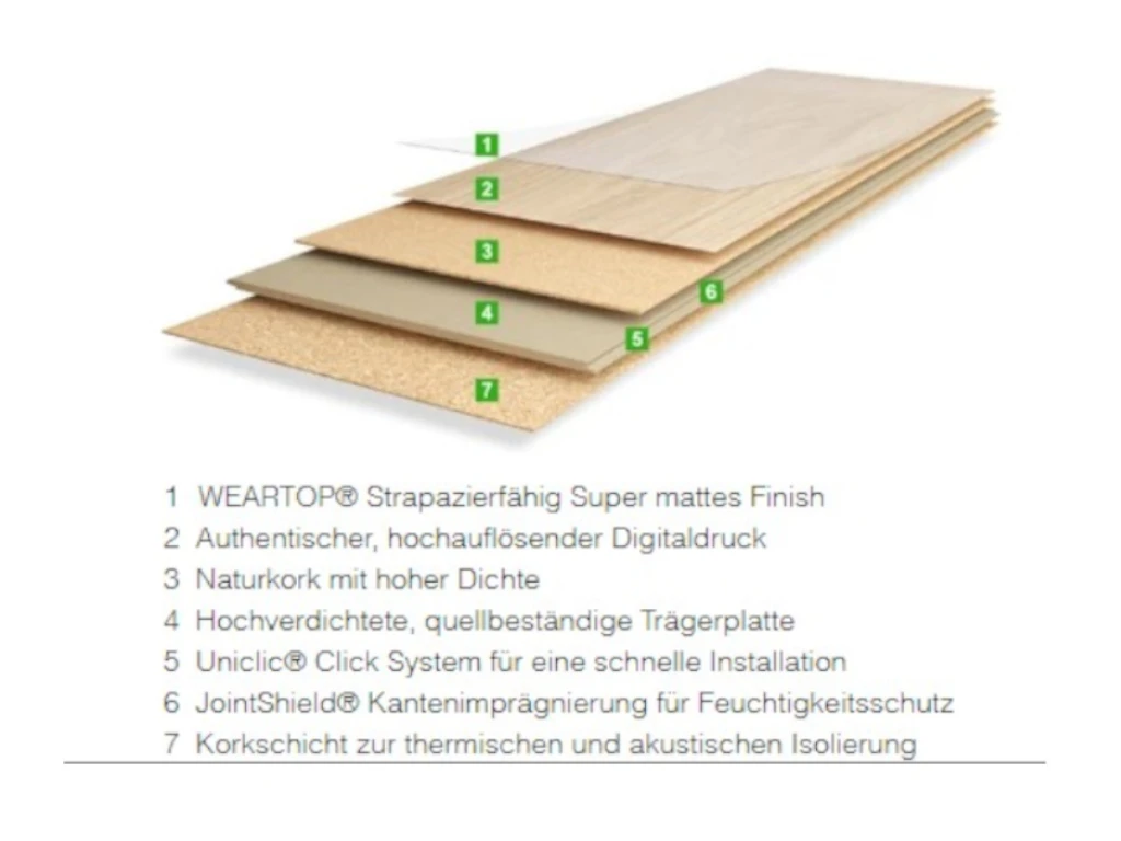 La surface est facile à entretenir, résistante aux rayures et solide. Combinée à une couche moyenne de liège hautement comprimé mais élastique, elle procure une sensation de marche agréable et offre une grande durabilité. La couche inférieure est constituée d’un panneau de fibres de bois à faible gonflement (HDF) qui garantit stabilité et une installation facile.