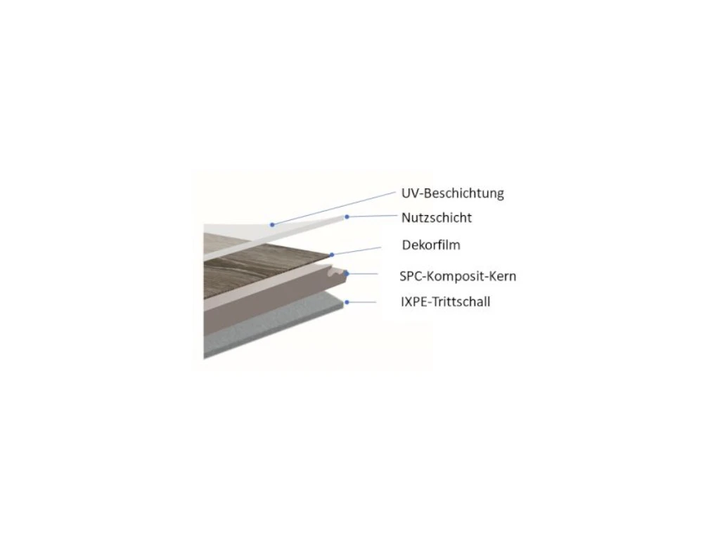 La structure de ce sol en vinyle est composée de cinq couches : sur le dessus, la couche d’usure traitée au PU, comprimée avec la feuille décorative pour former une surface résistante, puis le support en vinyle, en dessous le panneau support HDF avec système d’assemblage rapide, ainsi que le contrebalancement qui rend la lame stable.
