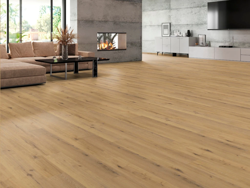 Les sols en vinyle suivent une structure à cinq couches : en haut, la couche d’usure traitée au PU et comprimée avec le film décoratif pour former une surface résistante, et en dessous, le support vinyle qui repose sur le panneau support en HDF avec assemblage par clic. La couche inférieure est constituée par la contre-traction qui assure la stabilité.