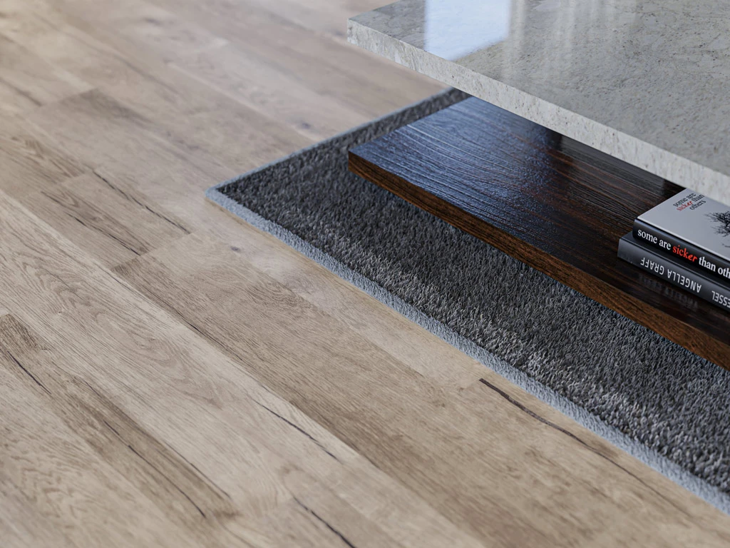 Ce sol est du vinyle rigide. Grâce au noyau SPC stable qui en est le cœur, ce type de vinyle présente également une rigidité et une robustesse accrues. Le vinyle rigide est ainsi particulièrement stable et peut être posé facilement sur un revêtement de sol existant. Grâce au support SPC, le sol résiste à la chaleur et est résistant à l’eau – idéal également pour les pièces humides, les vérandas et les pièces avec des fenêtres au ras du sol.