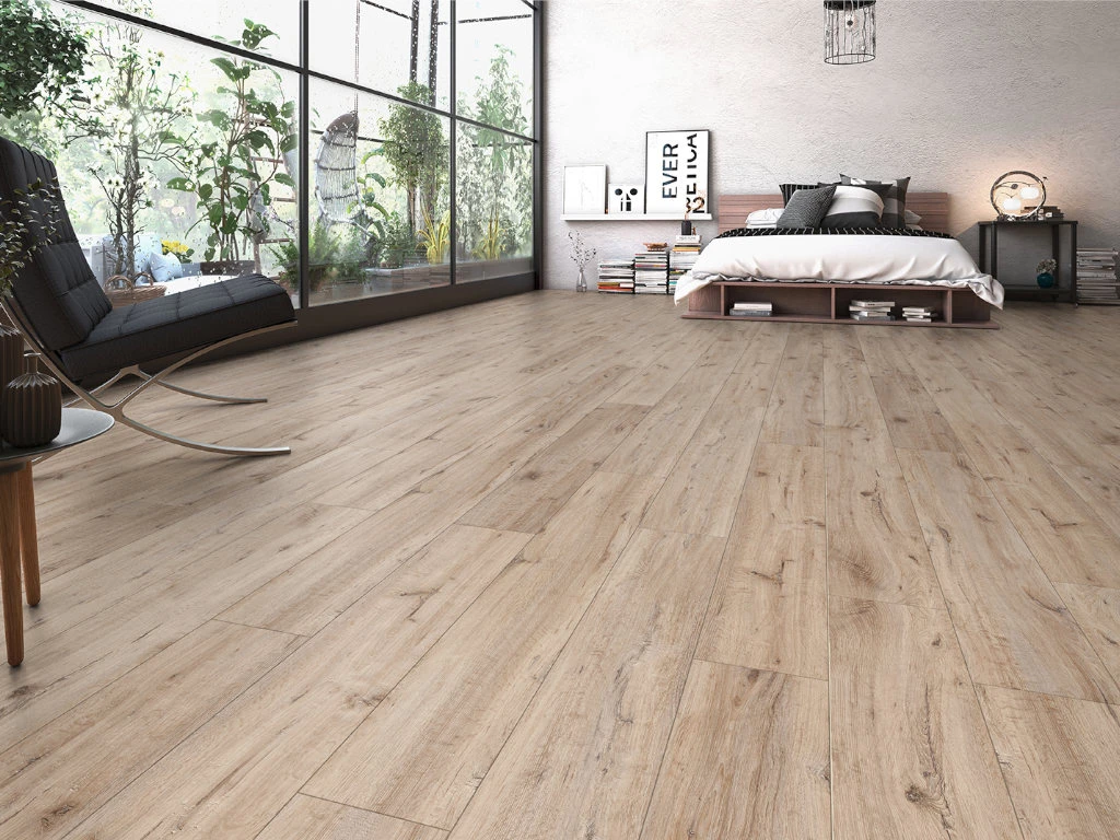Les sols stratifiés suivent une structure à trois couches : la couche supérieure pressée avec le film décoratif pour former une surface résistante, et en dessous, le panneau support HDF avec assemblage par clic. La couche inférieure est constituée de la contre-traction/du film stabilisateur qui assure la stabilité.