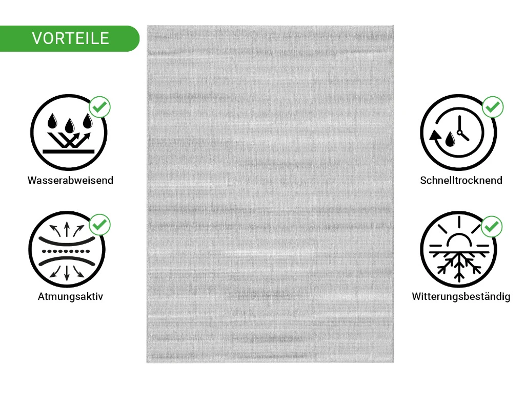 L’utilisation de ce tapis d’extérieur ne se limite pas à la terrasse. Il convient également parfaitement aux espaces intérieurs très fréquentés comme le couloir, la cuisine ou la véranda. La pose au-dessus d’un chauffage par le sol ne pose aucun problème. Que ce soit sous la table de jardin ou devant le coin salon, ce tapis d’extérieur certifié Oeko-Tex couvre parfaitement les endroits glissants ou peu attrayants et attire toujours l’attention.